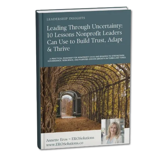 EROSolutions partners with nonprofit CEOs, boards, and executive teams to strengthen alignment, rebuild clarity, and scale sustainably. Led by Annette Eros, a seasoned nonprofit executive who has guided organizations through major growth, campaigns, and governance transformation, EROSolutions helps leaders expand their impact — without overextension or burnout.